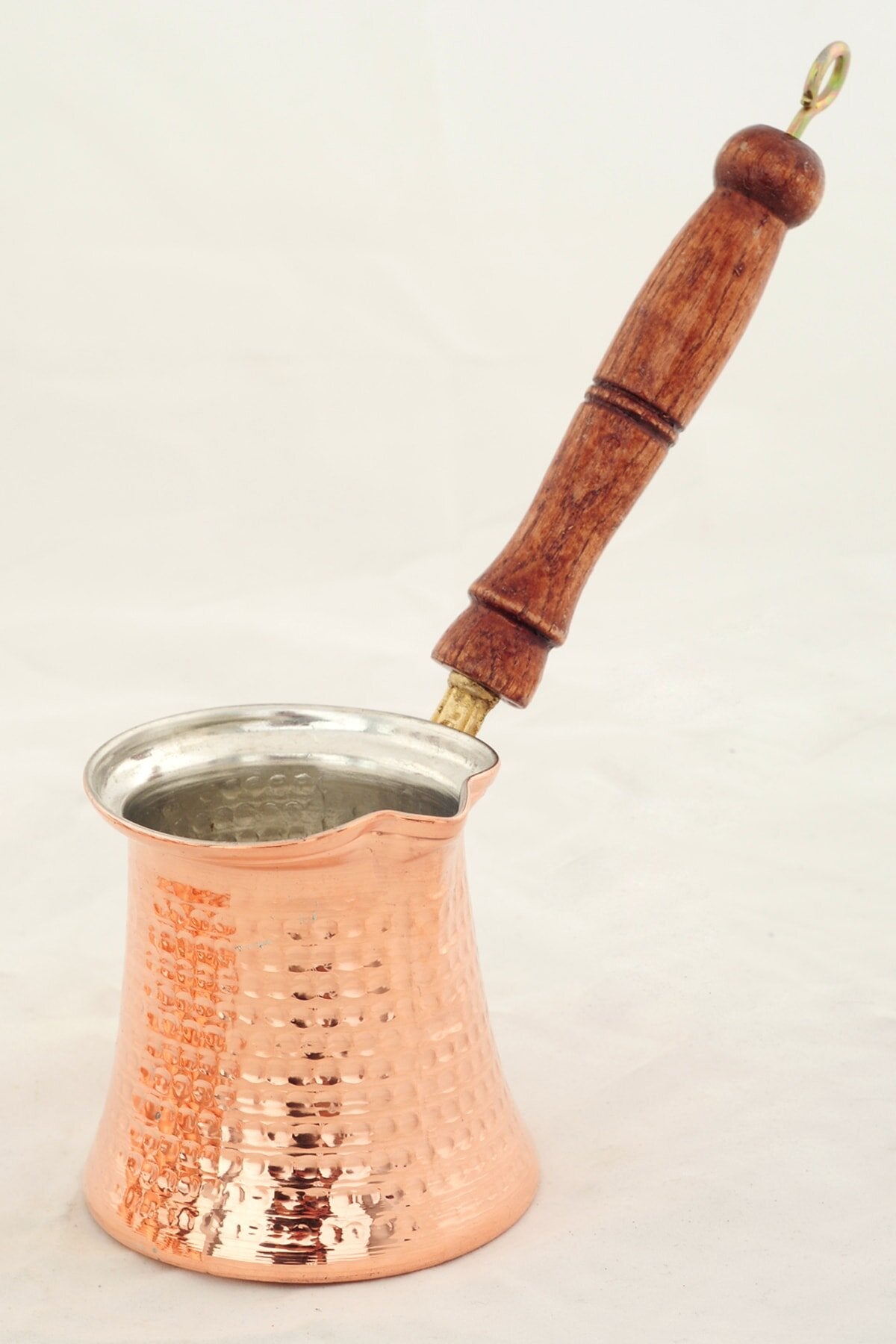 Details: Handmade engraved copper coffee pot with wooden pot spoon. Made with famous Turkish Copper in the Gaziantep City of Turkey by craftsmen with a century of experience in the copper industry. This pot's body is completely solid 2mm thick copper. Not lacquered. So it will develop a natural patina outside, as real copper should. Lined with food-safe lead-free tin. You can be assured this will last for many generations unlike other thin imitations found on Amazon. The coffee pot is made of the thickest copper available. Thus, it has maximum durability. Made by. (Amazon's best-selling Copper Bull Coffee Pots are made by, too).Capacity: 9 fl.Oz (270 ml) for 3 people. Diameter:3.5" Height: 2.8"GUARANTEED COPPER - AUTHENTICITY TEST: After receiving the pot, if for any reason you suspect that it is not copper, drill a hole anywhere on the pot's body and check the hole. You will see 2 mm thick copper along the hole. Nothing else. We will send you a replacement immediately if you decide to do this test and send us the photos afterward. (This test should be done within 7 days of receiving the pot to avoid abuse of the replacement guarantee).