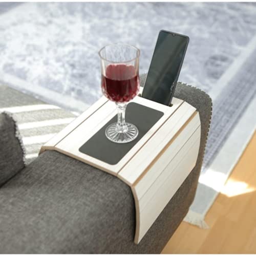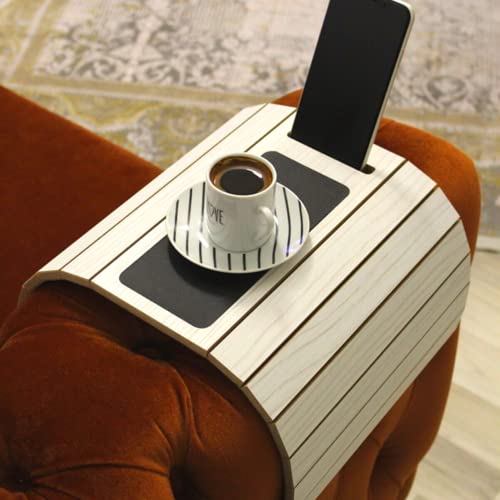 Bandeja funcional para sofá de madeira | Mesa de braço para sofá | Bandeja ajustável para braço de sofá | Mesa lateral para sofá | Bandeja de apoio de braço para sofá | Mesa bandeja de apoio de braço | Copo para sofá e suporte para telefone (branco)